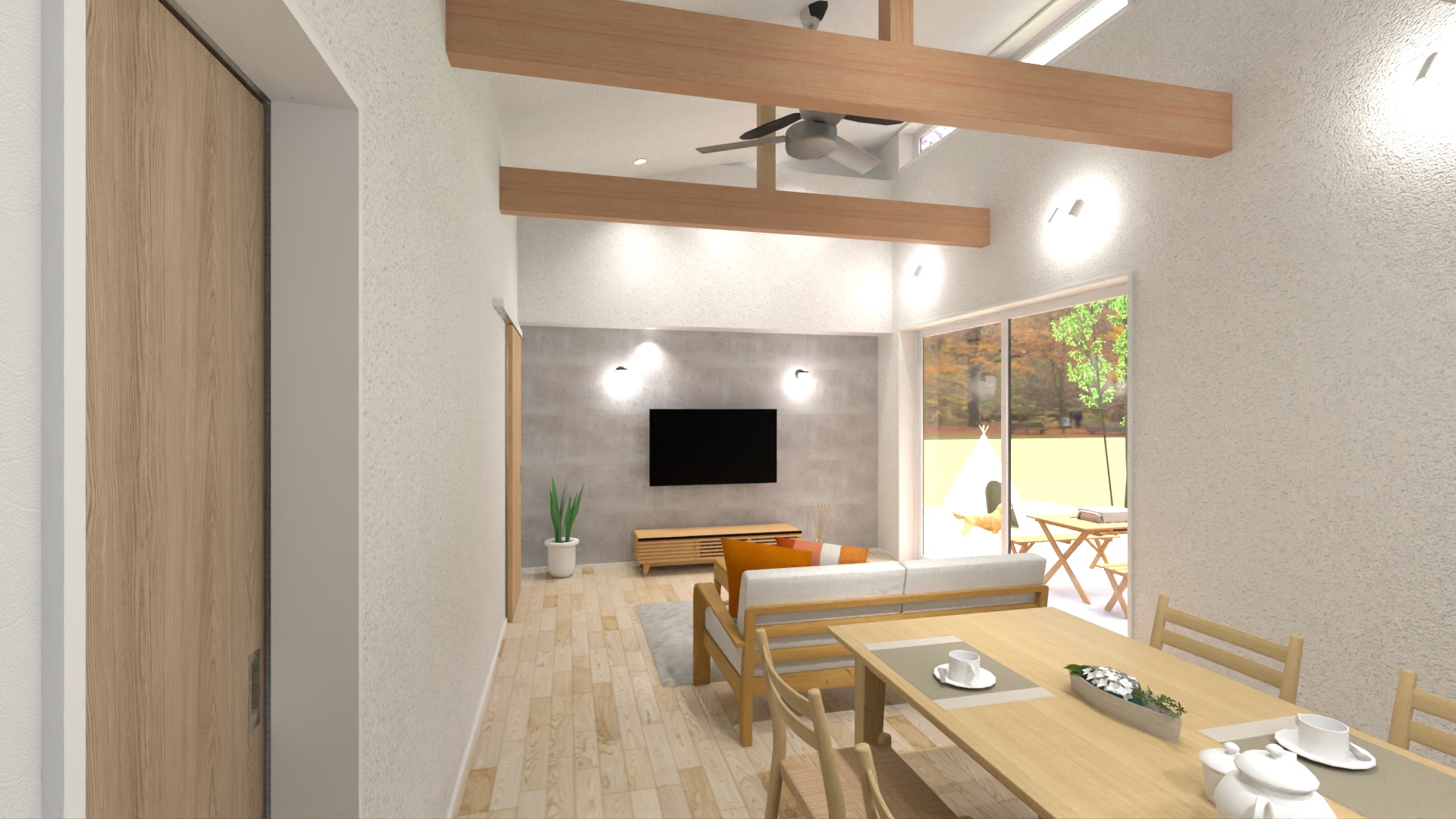 勾配天井のあるLDKと、そこから続くタイルデッキ。