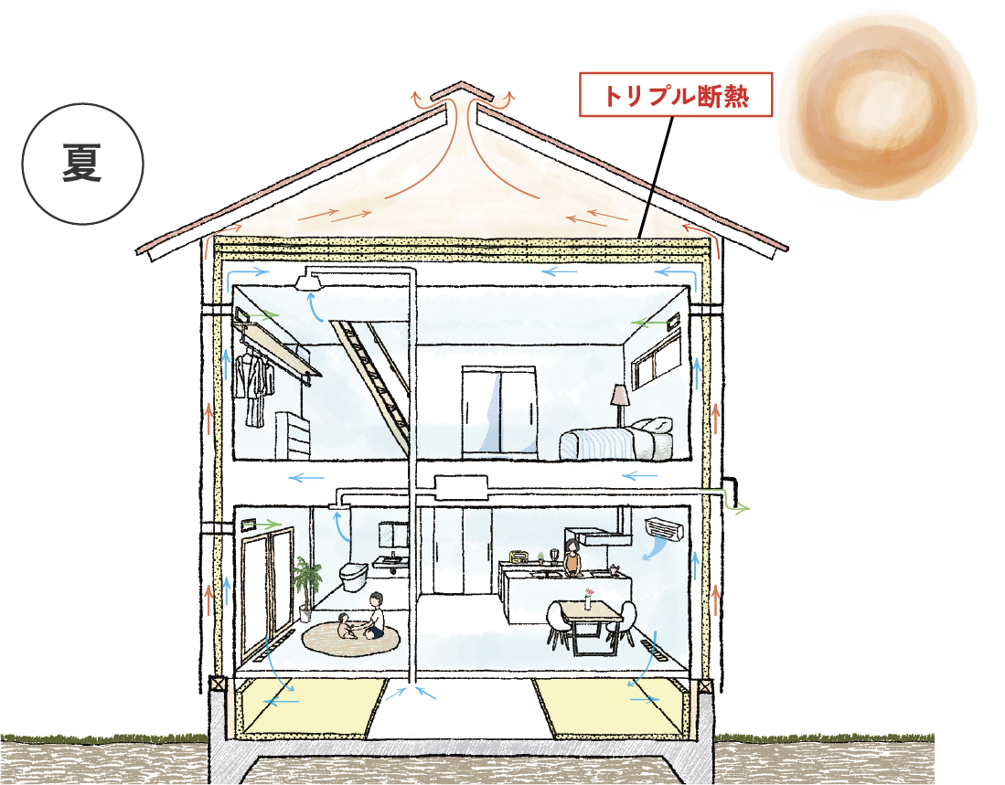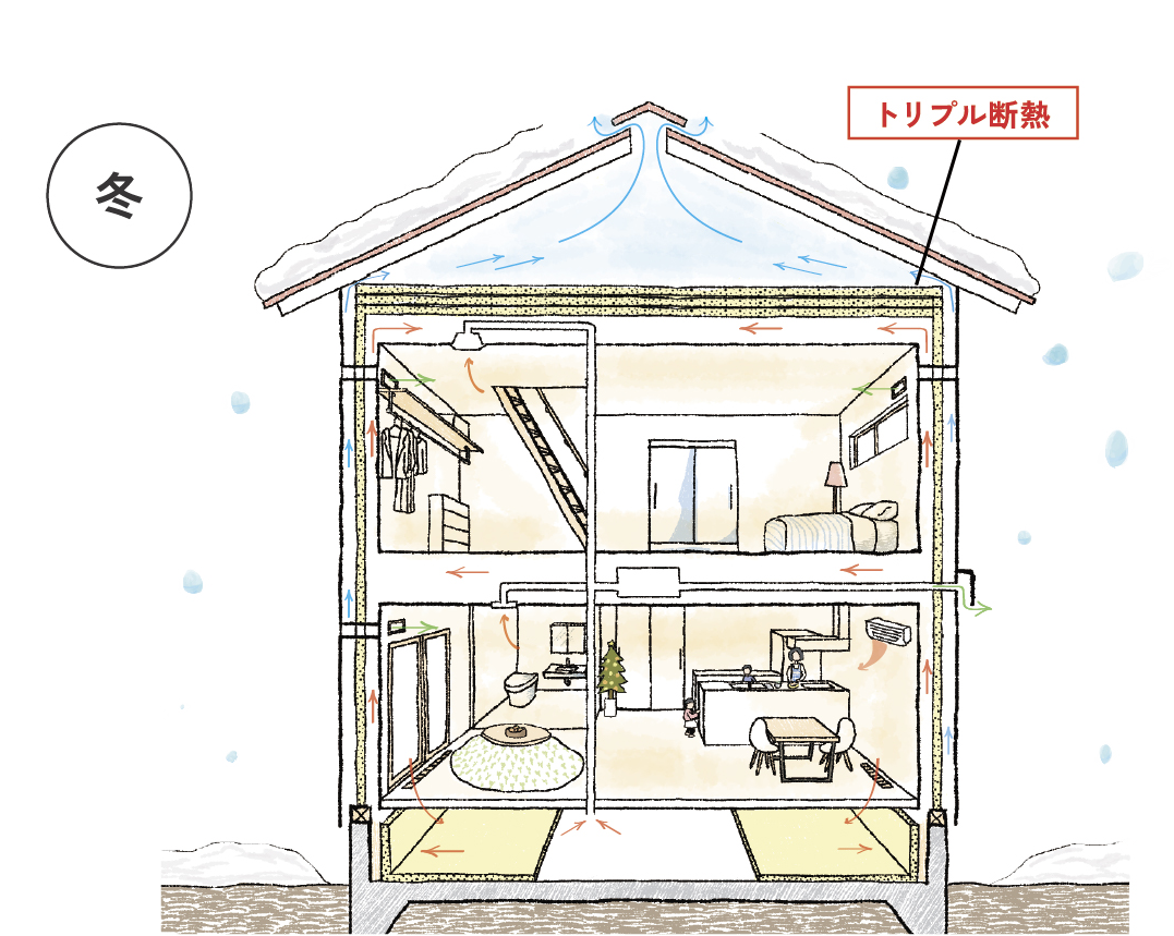 断熱材の外側は湿気がこもらないように、絶えず外気が流れています。内側も空気の対流が生まれることで、各部屋の温度が一定で暖かく過ごせます。