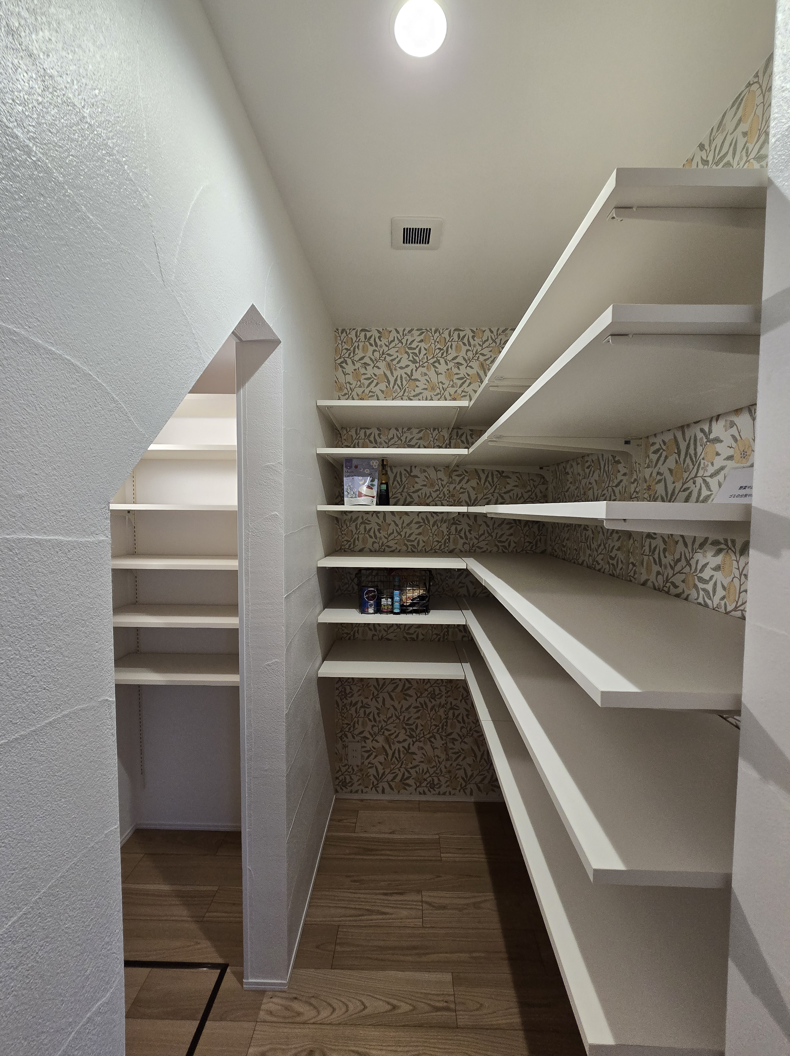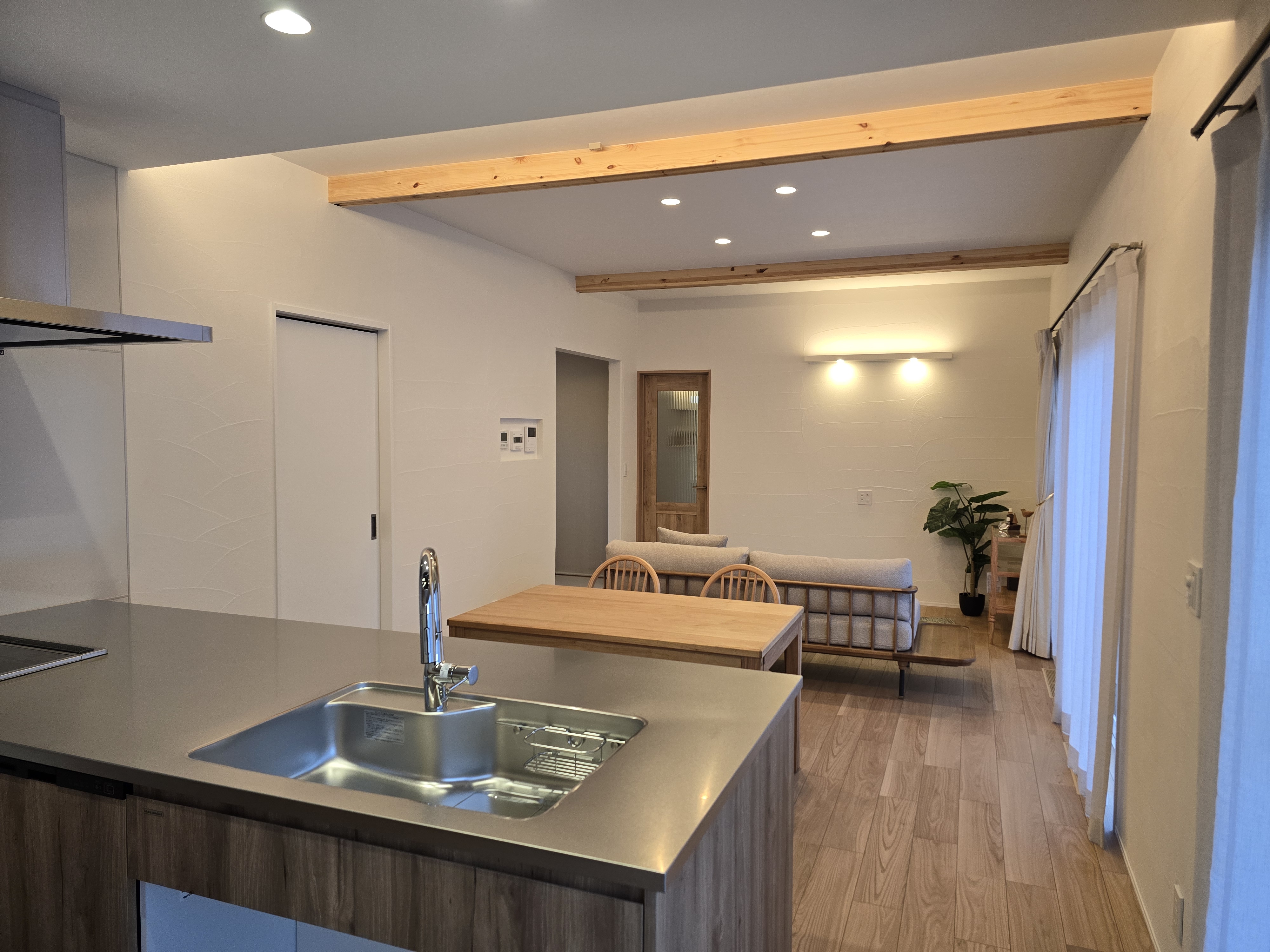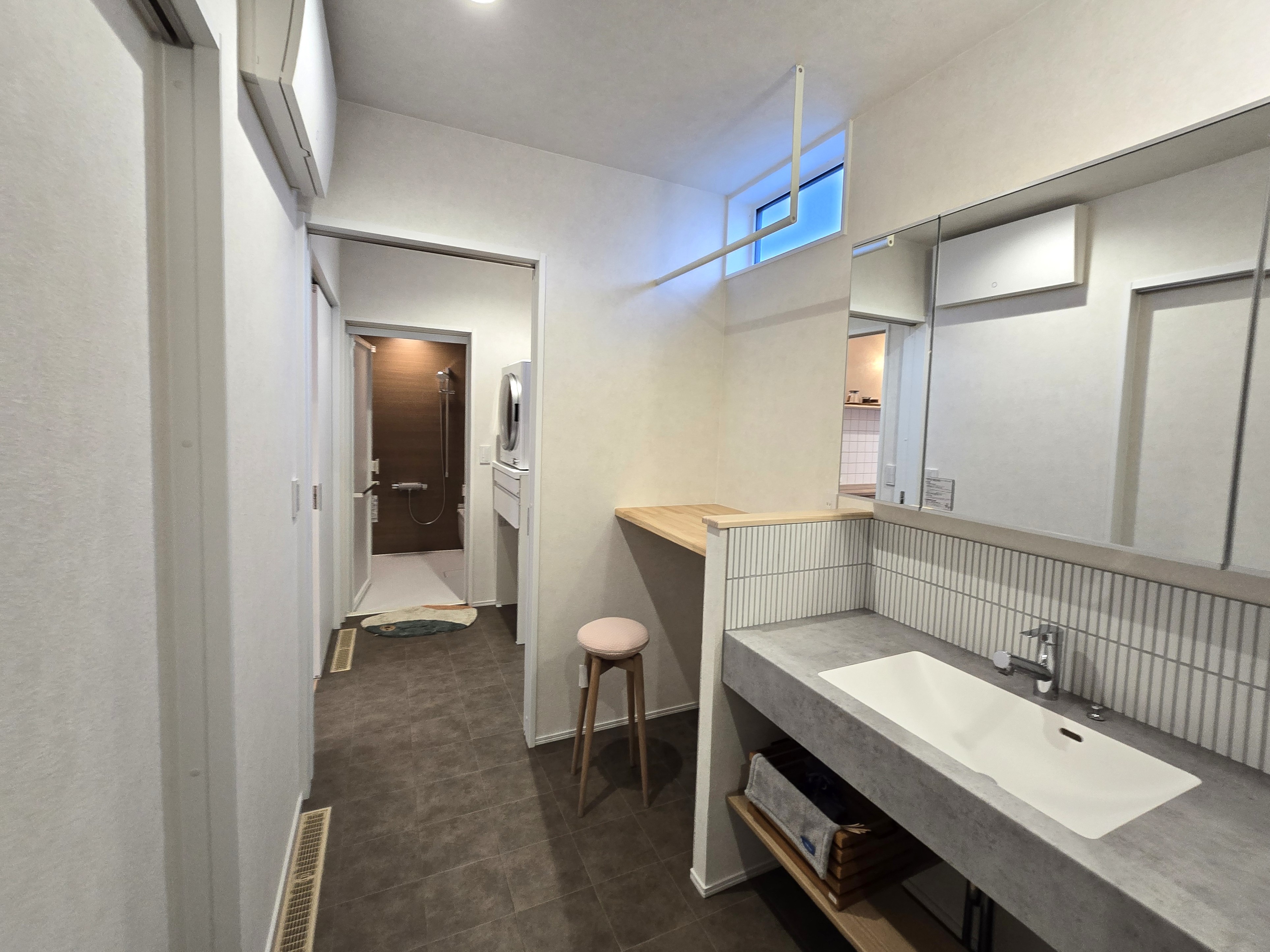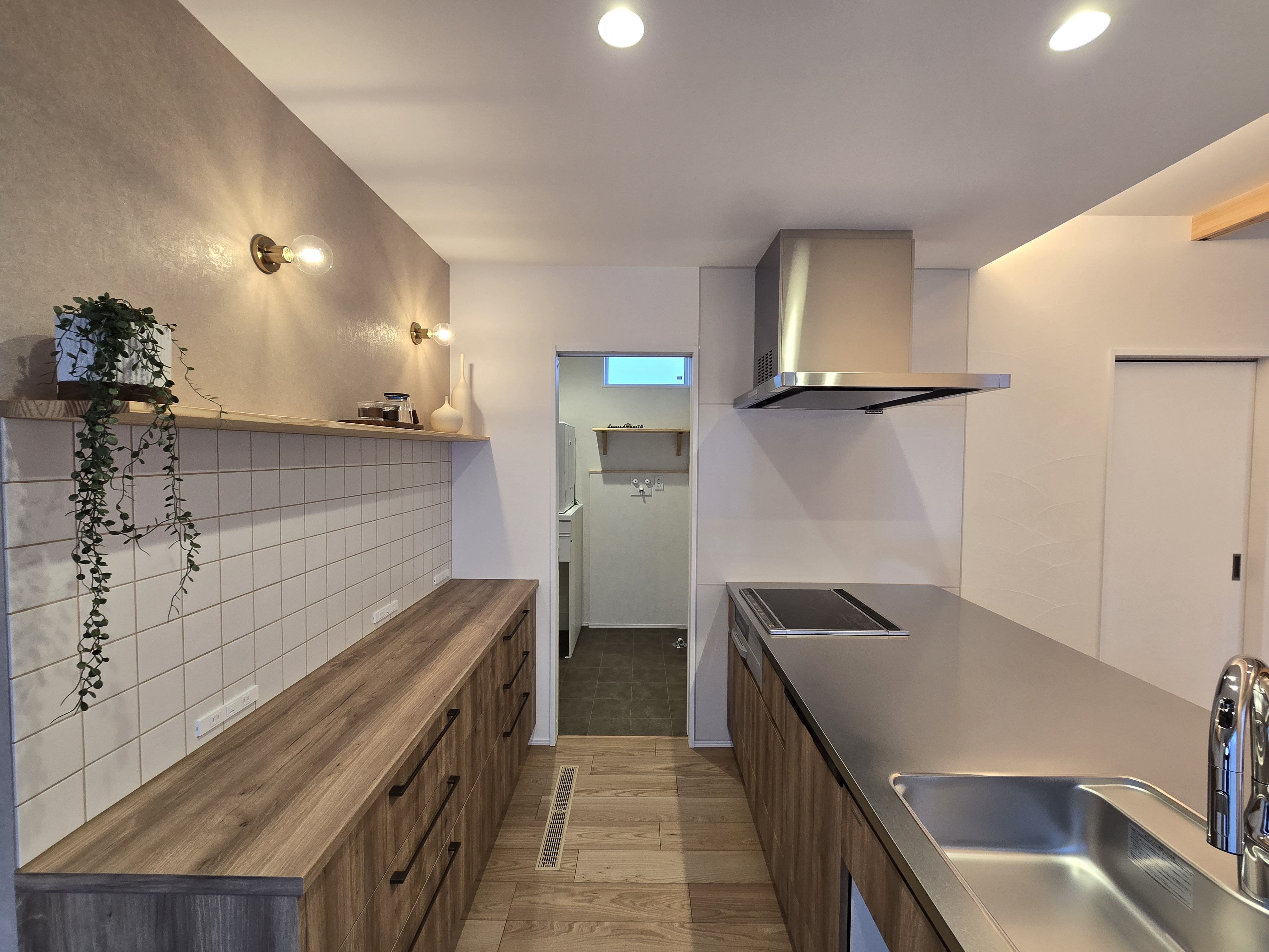 親世帯と子世帯が心地よく暮らせるように計画した共有の玄関からのホールで分かれる二世帯住宅です。 南面からの光や風を活かすパッシブ設計により、自然の力で快適さを維持しながら、 全館冷暖房システムで家中どこにいても温度差のない暮らしを実現しました。 室内は漆喰の壁と無垢材の質感がやわらかな空気を生み、快適で健康的に暮らせる住環境となっています。 さらに、太陽光パネルを搭載し、省エネ性・経済性にも優れた住まいに。 玄関からパントリー、キッチン、洗面室へと続く家事ラク動線は忙しい毎日を支え、 世帯それぞれのプライバシーと程よい距離感を保ちながら快適に暮らせる工夫が詰まっています。